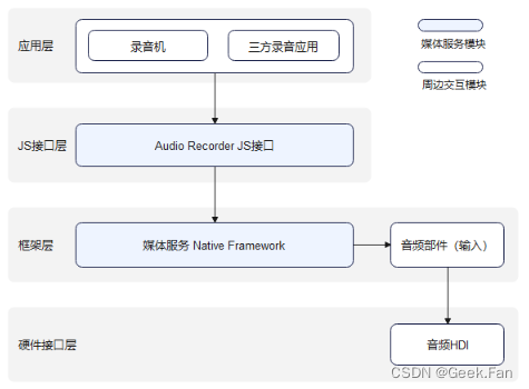 说明:三方录音应用或录音机通过调用JS接口层提供的js接口实现相应功能时,框架层会通过Native Framework的媒体服务,调用音频部件获取通过音频HDI捕获的音频数据,再通过软件编码输出编码封装后的音频数据保存至文件中,实现音频录制功能。