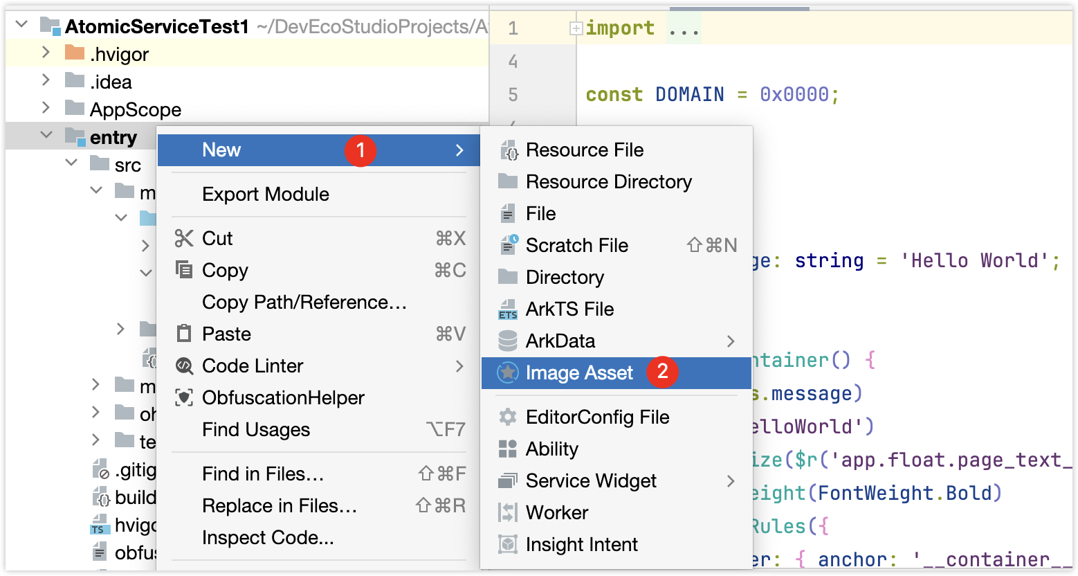 - 在工程中选中模块或文件,右键单击New > Image Asset,进入图标配置页面,选择满足要求的方形图片。