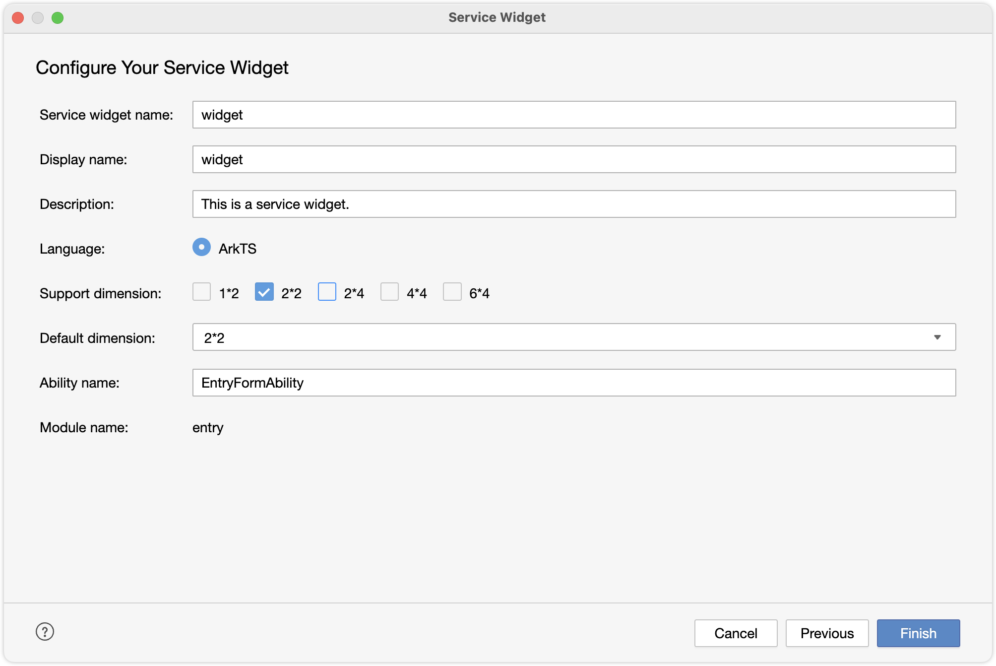 - Service widget name:卡片的名称,在同一个应用/服务中,卡片名称不能重复,且只能包含大小写字母、数字和下划线。