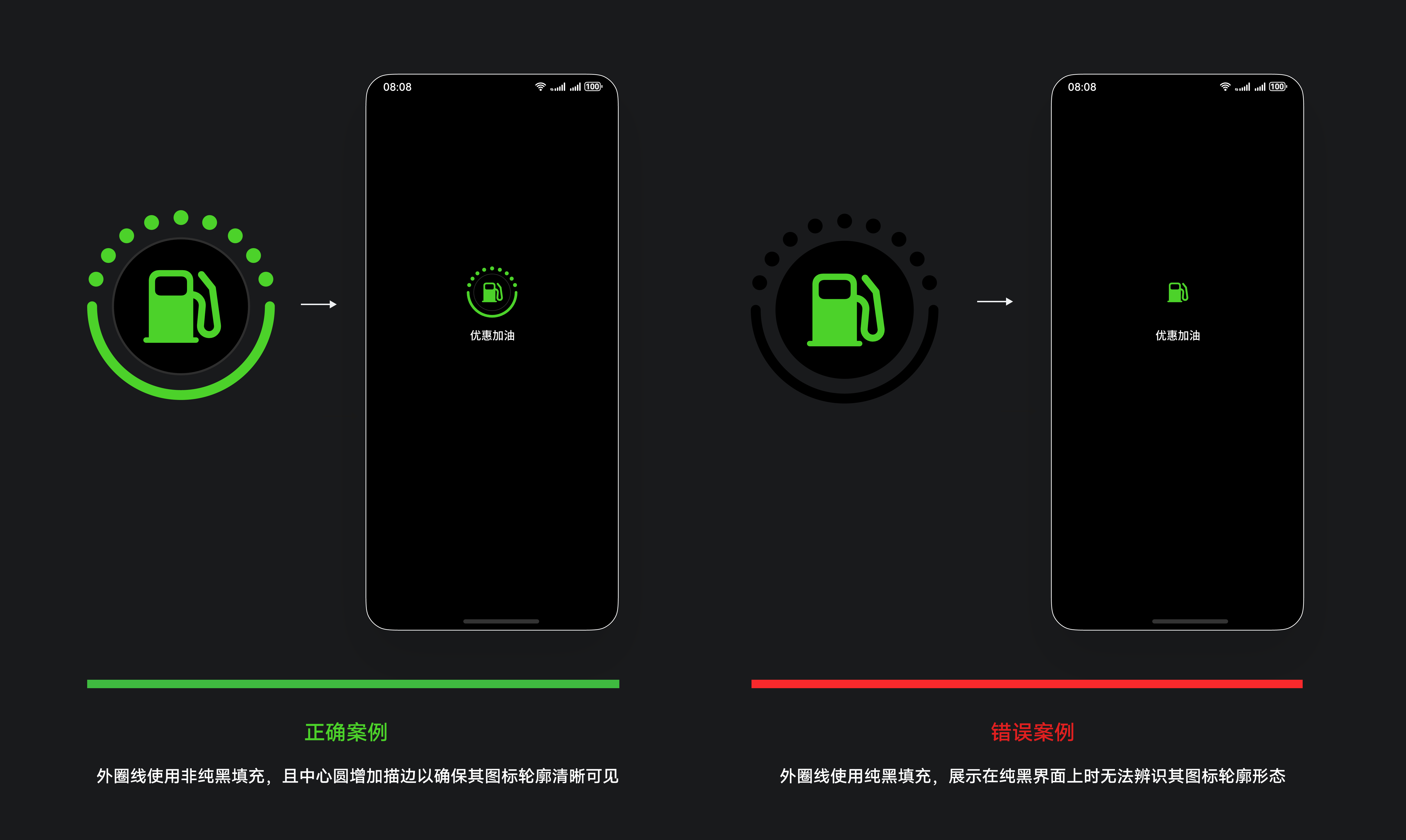 元服务图标外圈线请勿使用纯白或纯黑,以避免在纯白/纯黑页面背景上无法清晰辨识其轮廓形态。当中心圆背景为纯白/纯黑时,需给中心圆增加描边,以确保图标中心圆轮廓清晰可见。