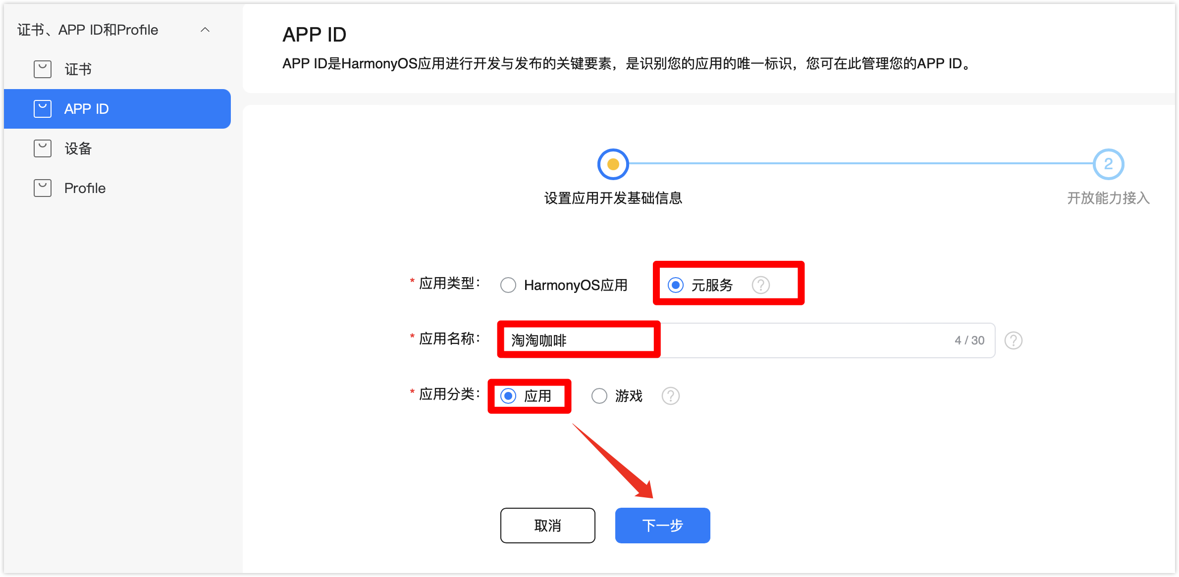 - 每一个HarmonyOS应用或者元服务都对应一个唯一的APP ID。先去APP ID页面创建应用,并填写应用类型、应用名称、应用分类。