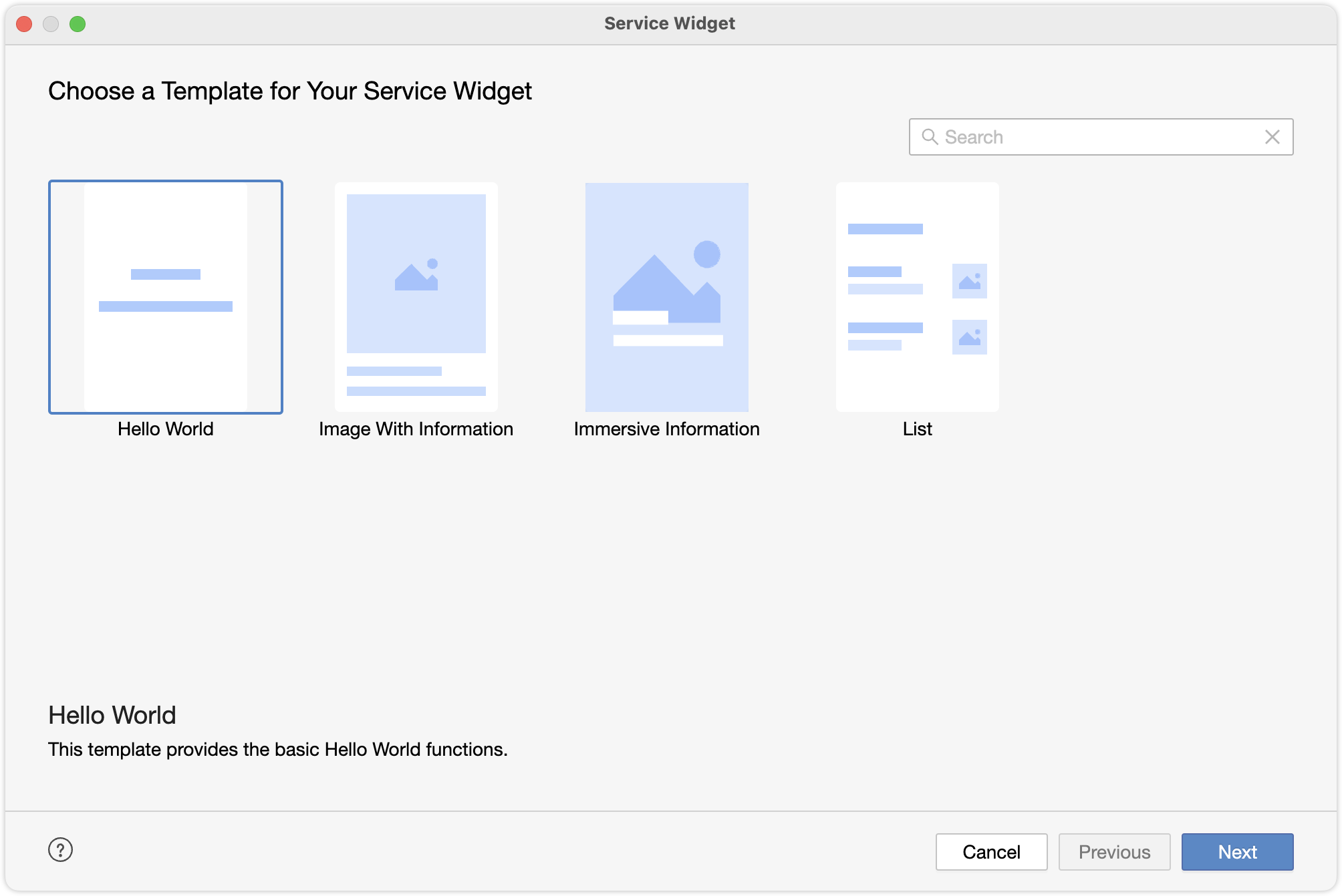 - 选择“Hello World”卡片模板,点击“Next”,进入卡片配置页面: