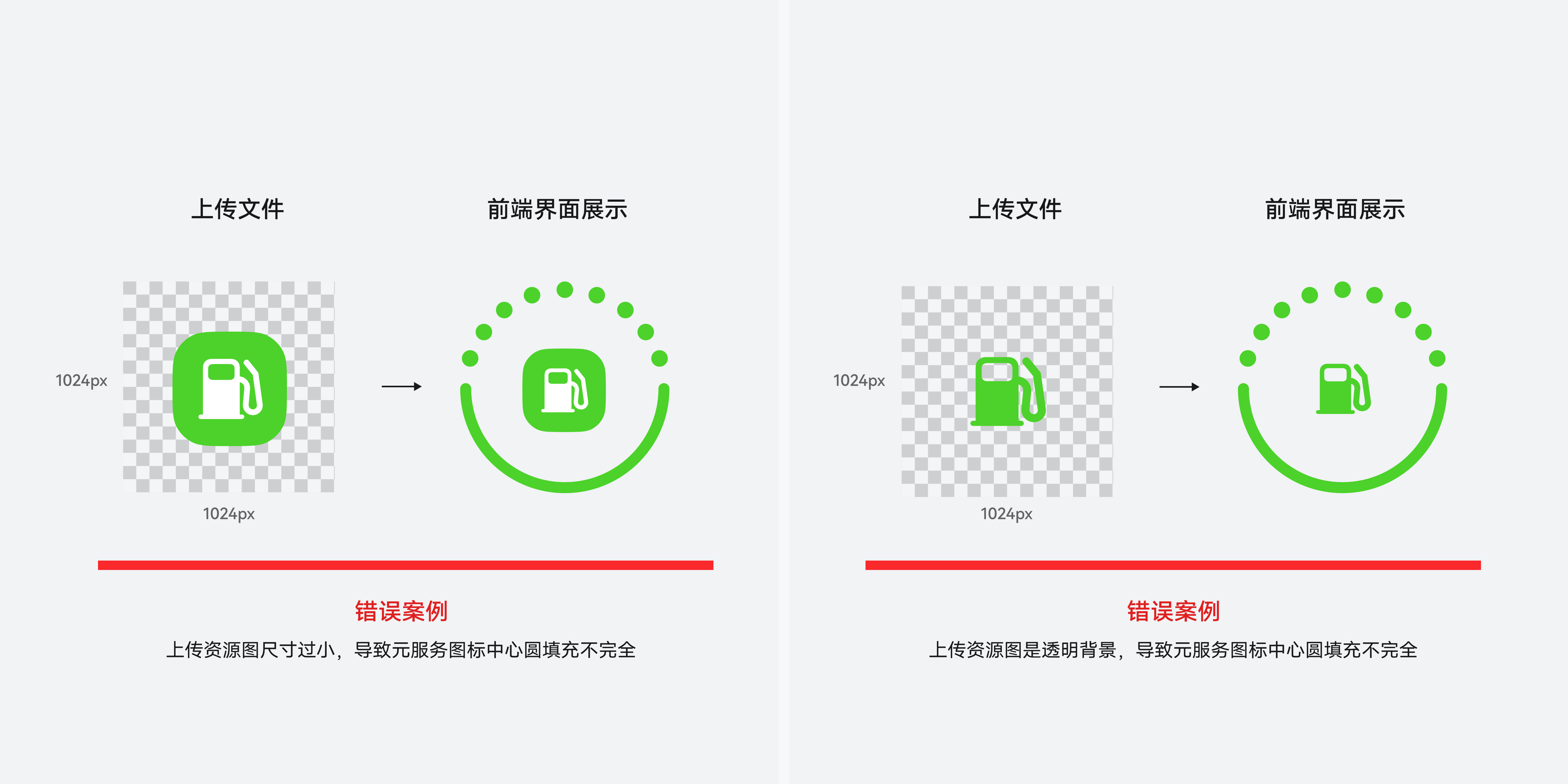 上传的资源图背景需确保为不透明背景,且资源图尺寸需满足要求。避免出现因尺寸或背景问题导致图标中心圆填充不完全的情况。(注:生成的元服务图标需确保图标中心圆为填充完全的正圆,不可出现其他形态)