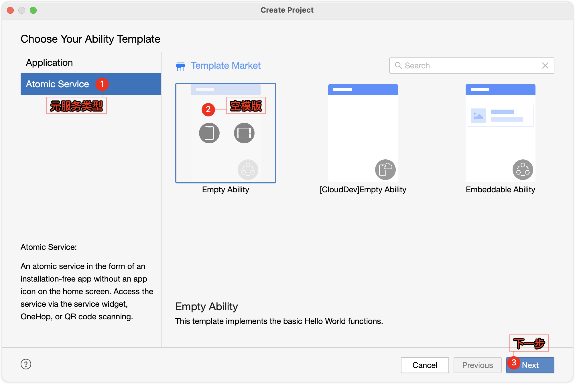 - 然后搭建开发环境,通过DevEco Studio创建元服务工程。
