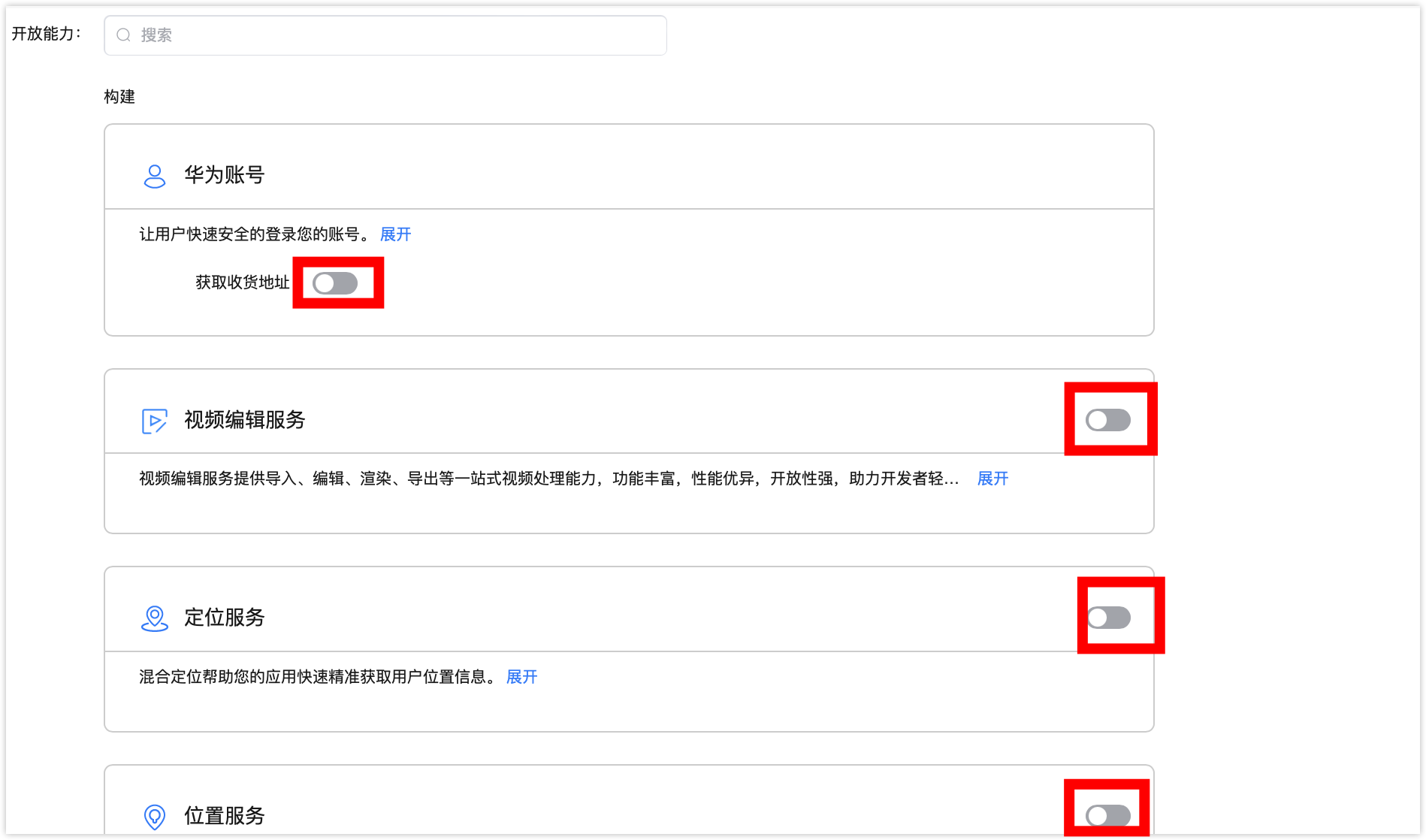 - 如果应用需要开放能力,可以选择打开对应的服务开关,如华为账号服务、定位服务、推送服务等。 如果不需要这些开放能力则不必选择。