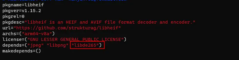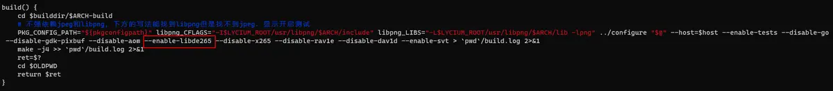 修改thirdparty/libheif/HPKBUILD构建脚本,添加libde265依赖,libde265的编译选项由disable改为enable,这样就可以在libheif编译时链接到libde265。