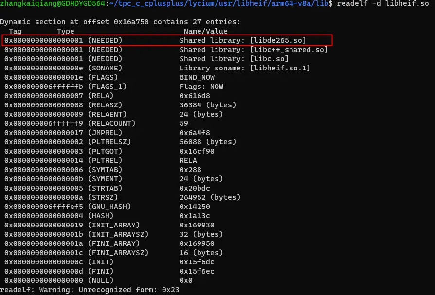 最后编译成功的产物可在/lycium/usr下获取,可以看到thirdparty/libheif/HPKBUILD依赖的库都成功编译了,并且查看libheif.so的属性,运行时会依赖libde265.so。