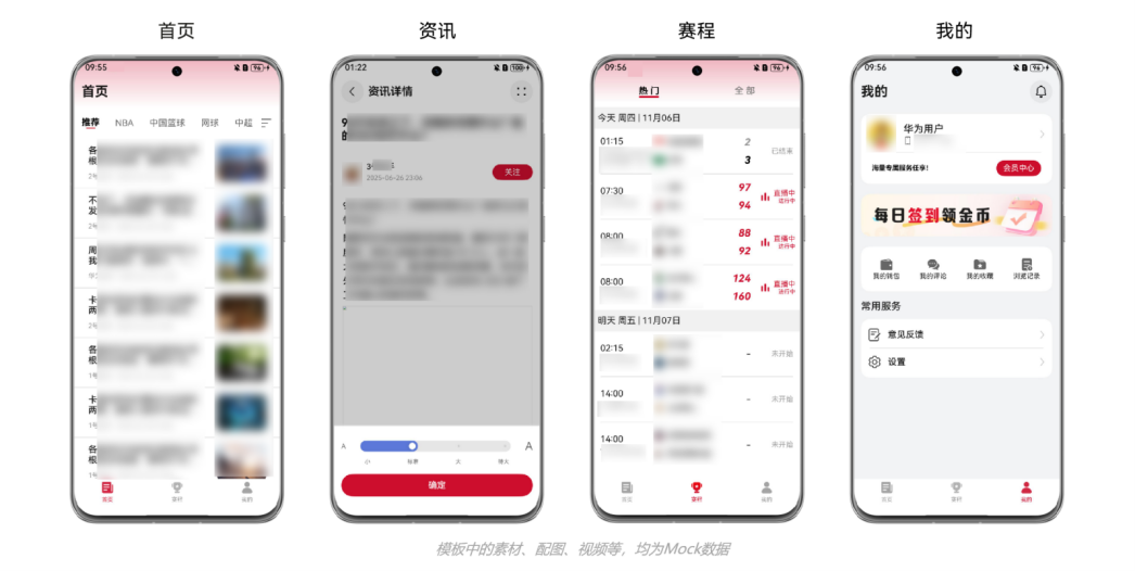 本模板为体育资讯类应用提供了常用功能的开发样例,模板主要分首页、赛程和我的三大模块。模板已集成华为账号、推送、预加载、广告、微信登录等服务,只需做少量配置和定制即可快速实现华为账号的登录、体育资讯阅读等功能。