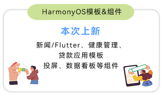 “新”意十足 · HarmonyOS模板&组件:本次上新:新闻(Flutter)、健康管理、贷款应用模板;投屏、数据看板等组件