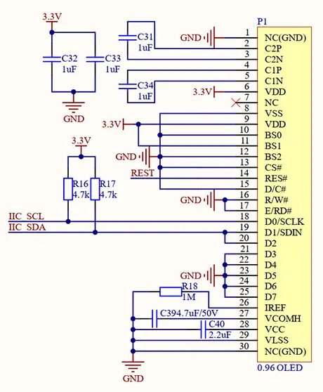 采用SSD1306芯片进行驱动0.96寸OLED显示屏,本显示屏使用黄+蓝屏幕进行显示。点阵数量为128*64。