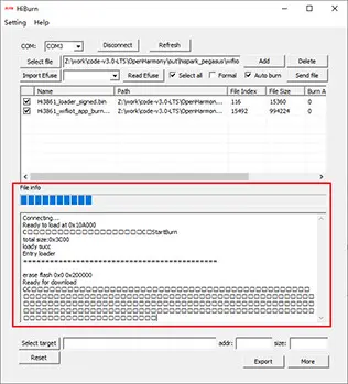 11. 会自动的添加.bin文件,添加完成之后,点击“Connect”按钮,然后复位开发板,即可开始烧写程序。烧写完成之后会有提示: