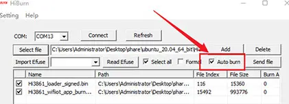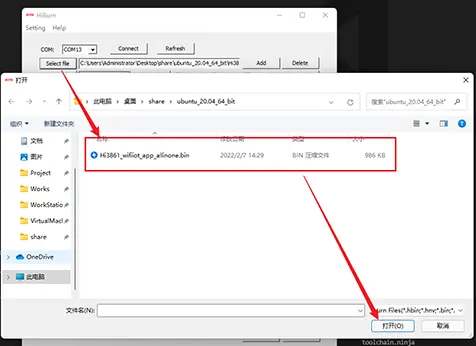 9. 此时需要开发本通过串口线连接电脑,电脑端的设备管理器会出现一个串口端口号,当然也可以通过烧写软件中“Refresh”按钮进行刷新,然后选择要烧写的bin文件,操作步骤如下图所示: