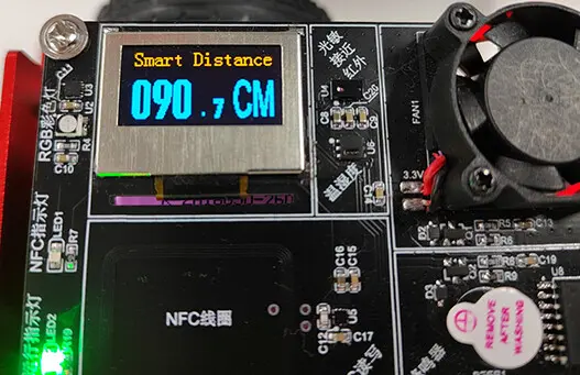 设备端烧写程序成功之后,按下“复位”按键之后,可以看到OLED显示屏上显示检测到的距离,并且当有障碍物遮挡的时候,蜂鸣器和红灯亮起,如下图所示: