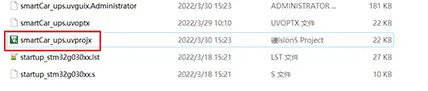 15. 双击打开工程源码文件夹的MDK-ARM文件夹下“smartCar_ups.uvprojx”keil5工程文件。