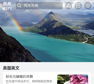 使用Stack控件使状态栏与列表重叠,并为列表添加滚动监听器,以根据滚动位置调整状态栏和导航栏的透明度及展开收起动效。Stack({ alignContent: Alignment.Top }) { Row() { // 动态显示回顶部或位置天气控件 if (this.isFlow) { this.topUpBuilder() } else { this.locationAndWeatherBuilder() } this.searchViewBuilder() this.toolViewBuilder() } .height(Constants.NAVIGATION_BAR_HEIGHT + this.statusBarHeight) .width(Constants.FULL_PERCENT) .padding({ top: this.statusBarHeight }) .zIndex(Constants.Z_INDEX_THREE) // TODO: 知识点:父组件的透明度Opacity影响子组件(如父类Opacity为0.5,若子组件为0.5时,子组件实际Opacity = 0.5*0.5),此处Row来改变状态栏的透明度不受影响其它组件透明度 Row() { } .backgroundColor($r("app.color.status_bar_animation_white")) .opacity(this.navigateBarOpacity) .height(Constants.STATUS_BAR_HEIGHT + this.statusBarHeight) .width(Constants.FULL_PERCENT) .zIndex(Constants.Z_INDEX_TWO) List({ scroller: this.scroller }) { // ... } // 隐藏滚动条 .scrollBar(BarState.Off) // 渐变蓝色背景色 .linearGradient({ colors: [[Constants.LIST_LINEAR_GRADIENT_START_COLOR, Constants.LIST_LINEAR_GRADIENT_START], [Constants.LIST_LINEAR_GRADIENT_END_COLOR, Constants.LIST_LINEAR_GRADIENT_END]] }) .height(Constants.FULL_PERCENT) .width(Constants.FULL_PERCENT) } .zIndex(Constants.Z_INDEX_ONE) .height(Constants.FULL_PERCENT) .width(Constants.FULL_PERCENT) // 扩展至所有非安全区域 .expandSafeArea([SafeAreaType.SYSTEM], [SafeAreaEdge.BOTTOM]) -
