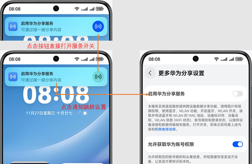简单触碰:当您想要分享某些内容时,只需将两台设备在亮屏、解锁的状态下并且都已开启华为分享服务(系统默认开启),设备顶部轻碰即可触发。