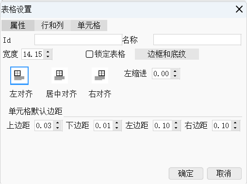 ID、名称、表格宽度、高度设置、锁定表格、边框和底纹、对齐方式、默认边距