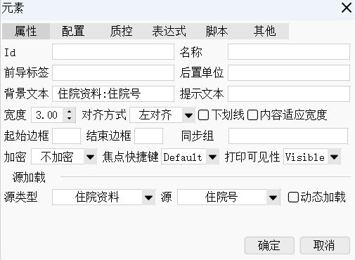 ID、名称、起始边框、结束边框、前导标签、后置标签、背景文本、提示文本、宽度限制、对齐方式