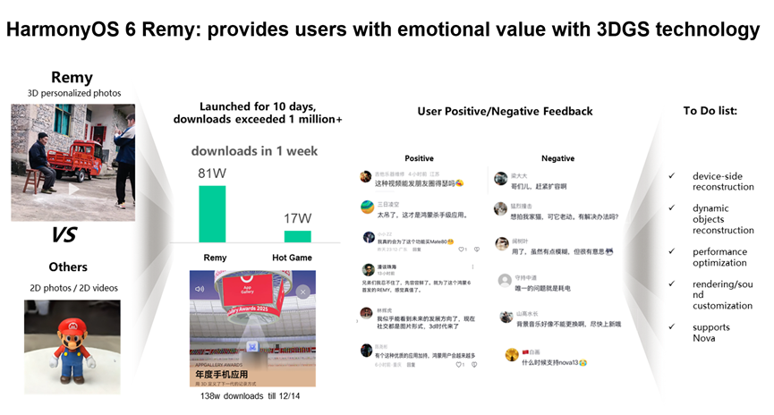 而随着GPU芯片能力的不断提升,AI+图形让3DGS换发了青春,重建和渲染速度都得到了加强,让3DGS的技术快速发展和使用。今年在鸿蒙系统上独有的Remy应用就是这个过程中的产物,Remy一经推出,迅速让消费者非常喜欢,短短9天下载量突破100w: