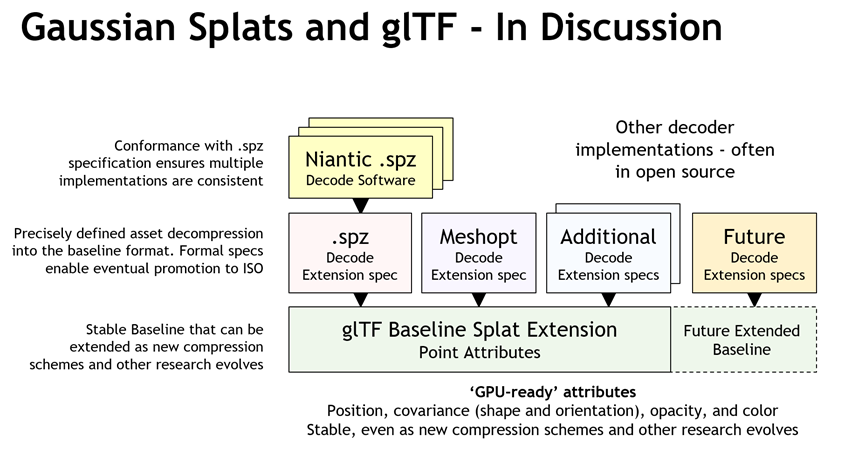 3)还有一件事情特别值得提及,那就是3DGS和glTF的结合。因为上述3DGS的持续火爆,3D领域急需要一个新的3D标准,以能够带有3DGS的新的表达,而行业上的AOUSD和glTF就是两个很重要的渲染。无奈,AOUSD较为封闭,而glTF就成为了大家的渲染。我们看到了glTF的标准在快速接纳3DGS,而且相信2026年这一变化会非常快地在生态上得以推广: