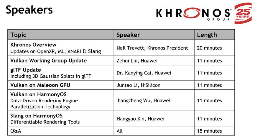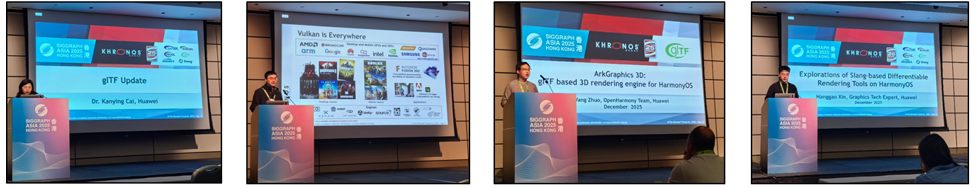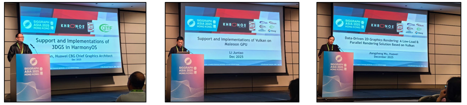 而2025年的Siggraph Asia我们有更多的议题入选,还有一个3DGS的专场,范围涉及Vulkan/glTF标准、2D DDGR、3D AGP、3DGS、可微渲染、马良GPU介绍等等,由各领域图形专家亲自分享,这是一次全面地向整个行业介绍华为的图形栈(方舟图形引擎),也是向行业介绍鸿蒙图形的当前与未来: