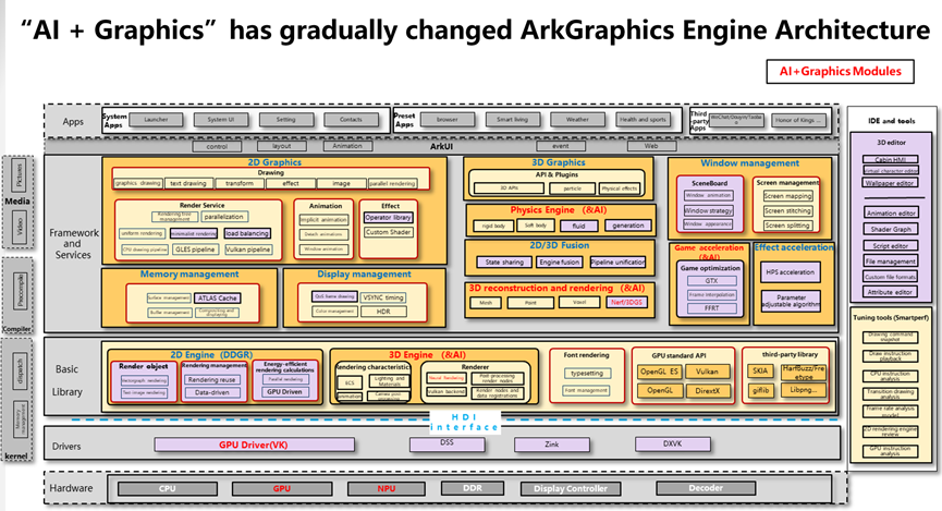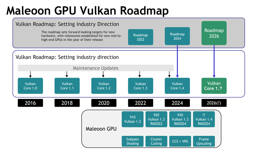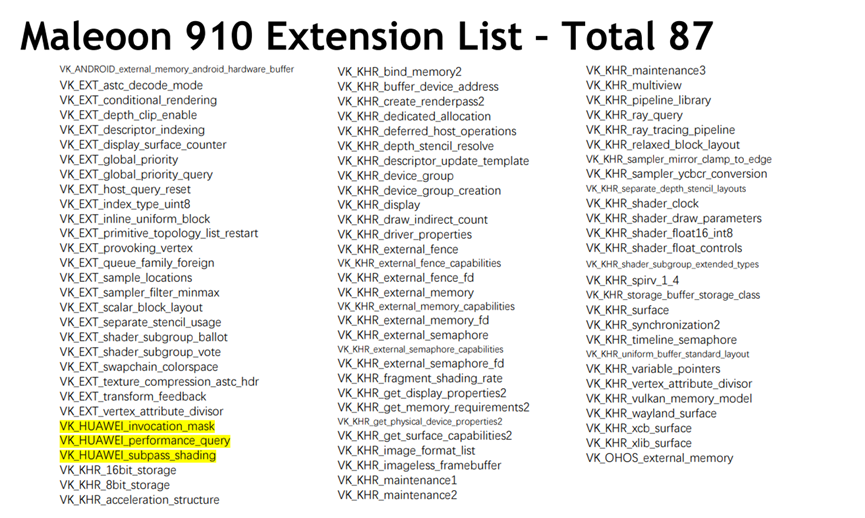 鸿蒙方舟图形引擎在2023年就已经从古老的GLES切换到Vulkan,是行业上首个在操作系统维度上支持Vulkan API并大规模使用的引擎,Maleoon的GPU和API也在Vulkan的基础上做了支持和扩展: