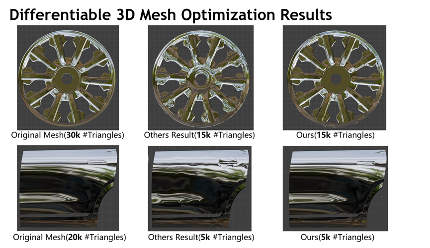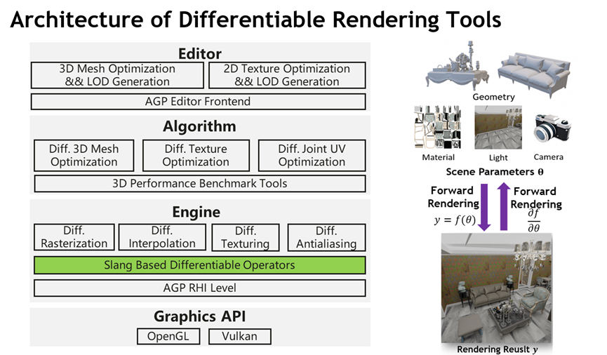 不仅如此,鸿蒙方舟图形引擎在可微渲染领域也有新的探索,我们使用可微渲染,可以在开发态迅速生成对应的资产(Shader、Mesh、纹理),让它可以用于不同算力的机型: