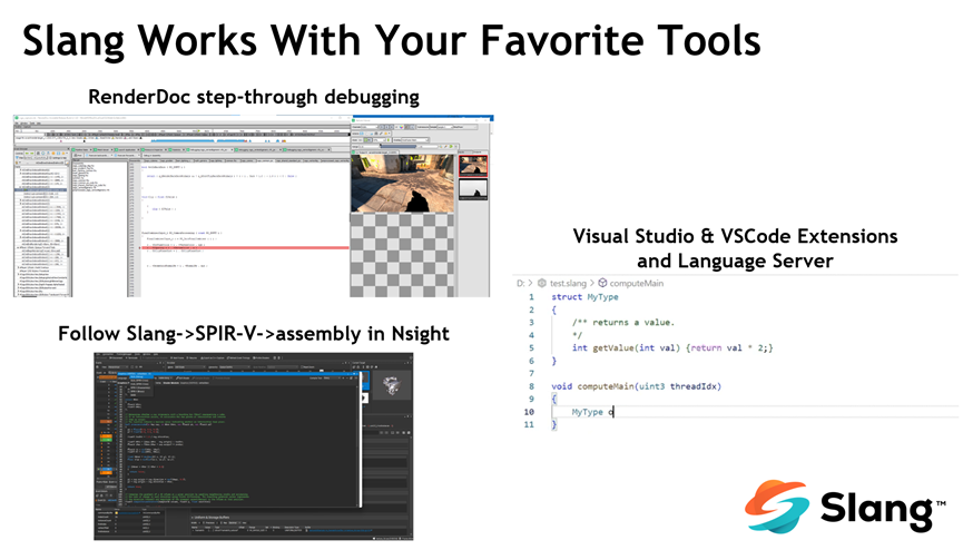 不仅如此,Slang当前还和一些工具进行了很好的结合,比如Renderdoc、VSCode等等,让开发者可以进行它的快速调试: