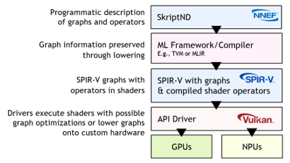 结合上面的这种图就可以看到,无论是基于机器学习的框架(TensorFlow、PyTorch)还是编译器与运行库(oneAPI、IREE、ONNX)以及API/SDK(Metal、DX、Vulkan、OpenCL等),碎片化非常严重。因此,我们在图形领域,急需要一个新的表达来引入AI渲染,而基于SPIR-V以及NNEF的表示就是最新的探索: