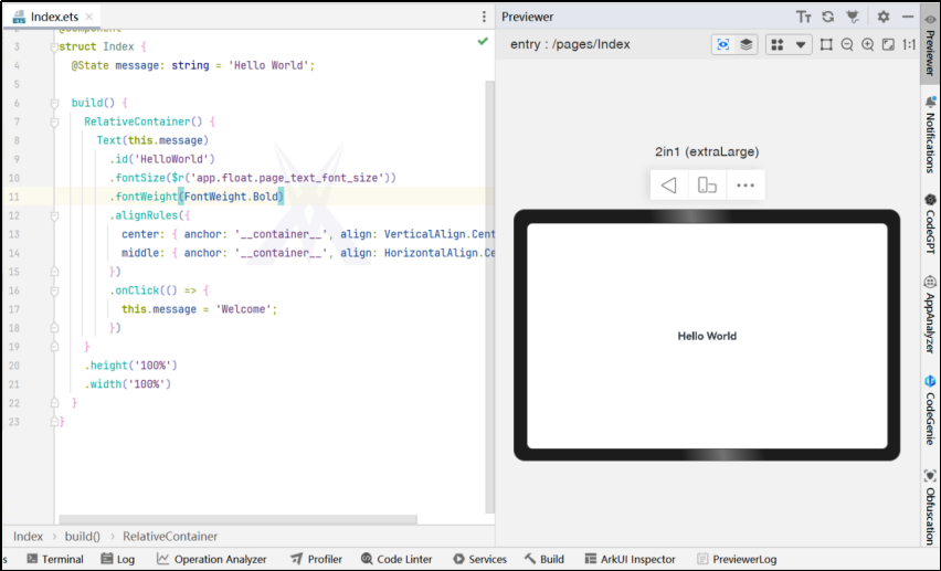 默认创建Index.ets界面,开发工具可分为“左侧目录结构”、“代码区”和“预览区”。