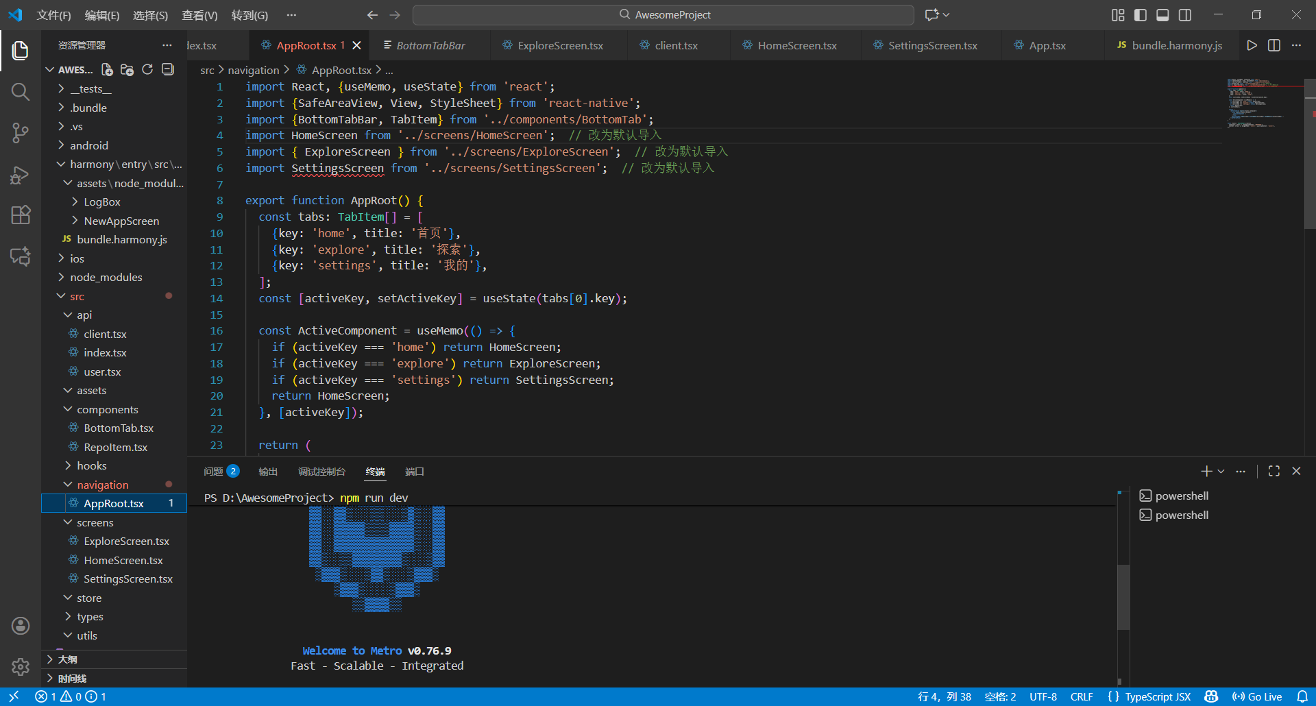 修改"src/navigation/AppRoot.tsx"的代码