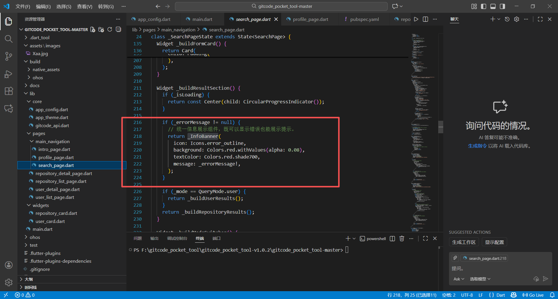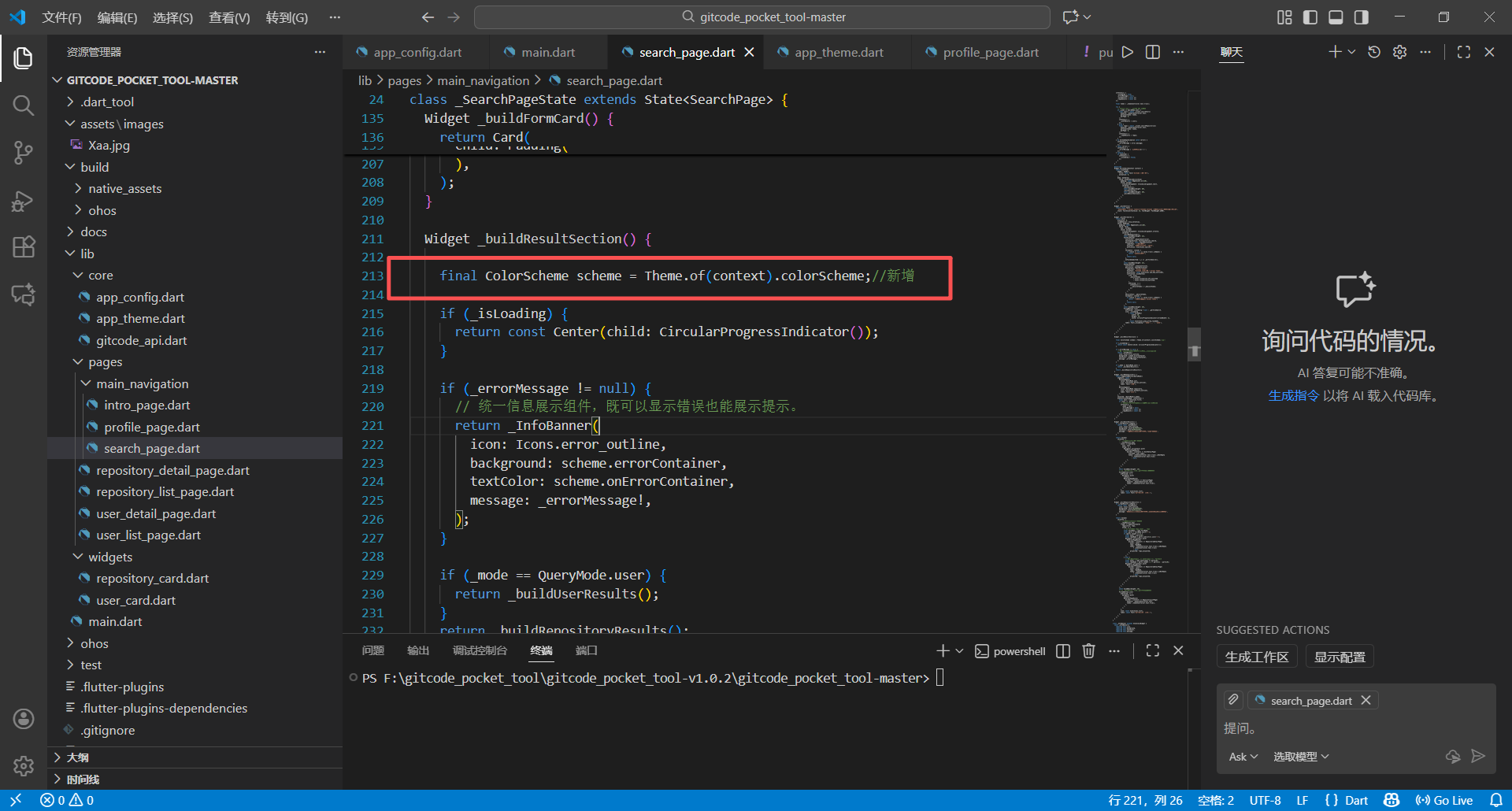 路径:lib/pages/main_navigation/search_page.dart,改造提示组件颜色配置,过程中遇到“scheme”变量未定义的报错,解决方案如下: