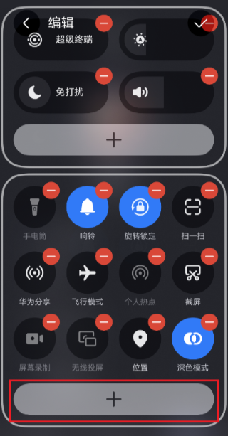 - 在功能列表中找到“深色模式”选项,点击【加号】完成添加;