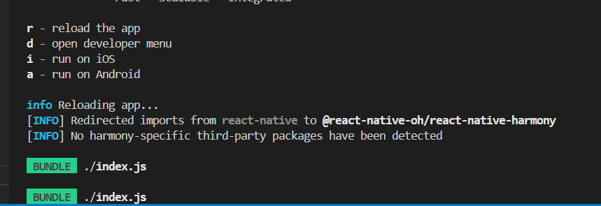 在AwesomeProject项目的根目录,执行"npm run start"的命令,会出现让你选r、d、i、a的选项。我们在终端输入r即可。