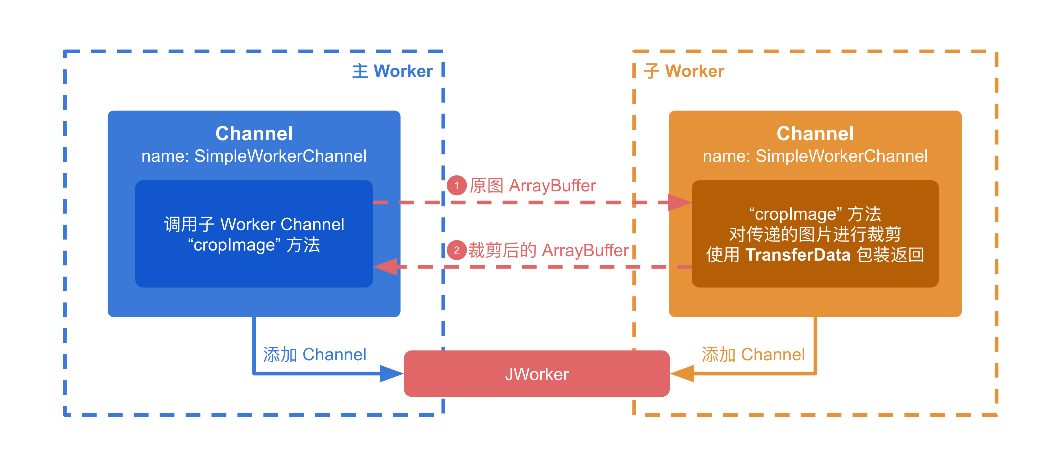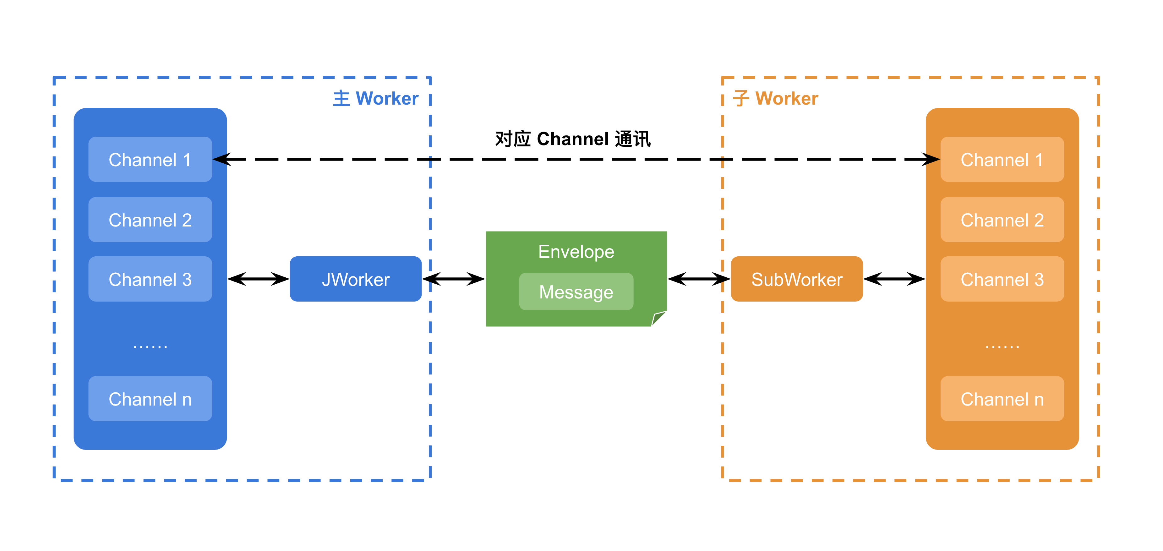 JWorker实例,添加渠道后进行各自 Worker 通讯。