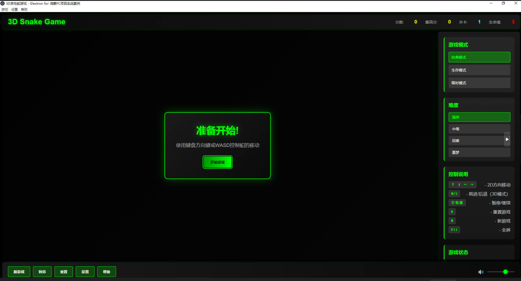 这是一个基于 Electron 和 Three.js 开发的跨平台 3D 贪吃蛇游戏应用,实现了三维空间中的贪吃蛇玩法,玩家可在 X、Y、Z 三个维度控制蛇的移动。本项目不仅展示了 Electron 环境结合 Three.js 创建高性能 3D 游戏的实现方案,还新增鸿蒙 PC 平台专属适配改造内容,通过 Electron 鸿蒙适配层实现底层兼容,优化 3D 渲染性能、输入设备适配与系统集成能力,确保游戏在鸿蒙 PC 设备上具备稳定流畅的运行体验与原生交互特性。