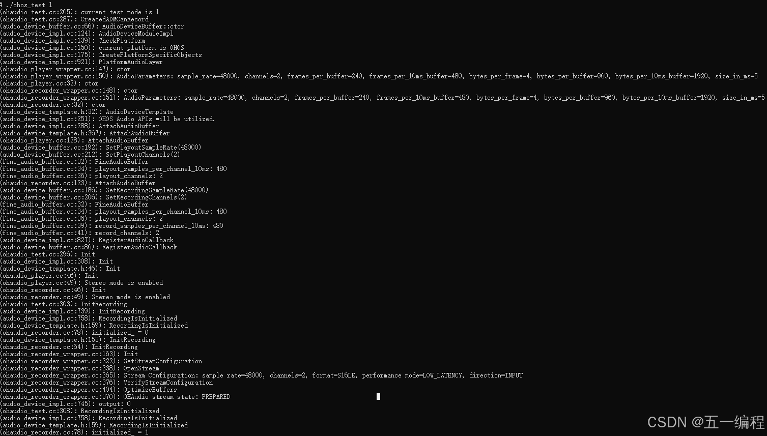 ./ohos_test 1 # 参数说明:0(播放,依赖resource下的音频文件,resource需要放在/data/目录), 1(录制), 2(同时录制与播放)。