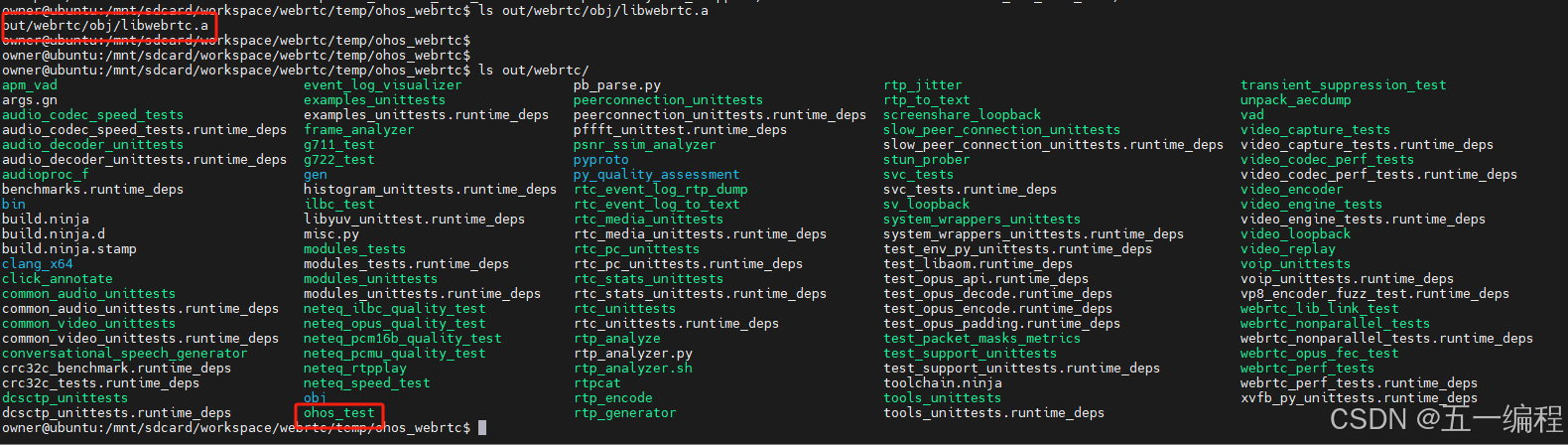 编译成功后会在out/webrtc/obj目录下生成libwebrtc.a, 在out/webrtc目录下生成对应的测试用例,其中ohos_test是视频了OH平台的音频测试用例。