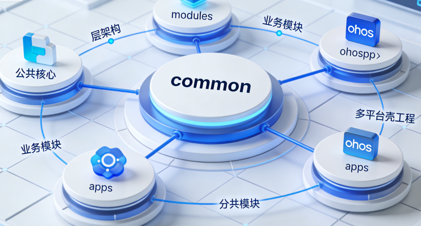 合理的项目架构是后续维护的关键,推荐采用 "公共核心 + 多壳工程" 的模块化架构,支持鸿蒙与其他平台的并行开发。