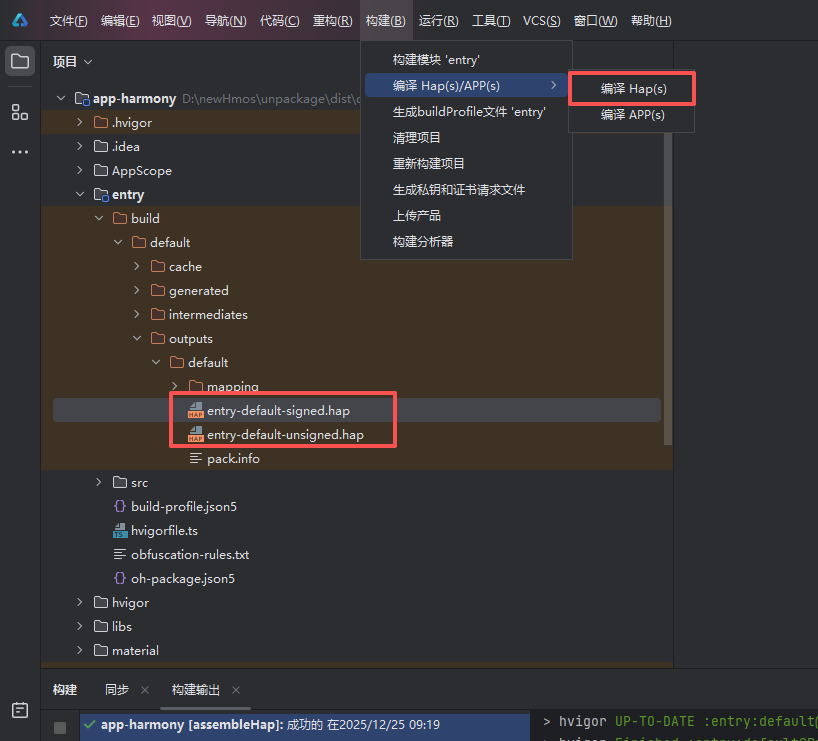 二、将生成的好的包在DevEco Studio中打开,直接点构建编译为Hap,就会生成两个安装包。signed为签名版,unsigned为未签名版,安装包直接在手机上进行安装