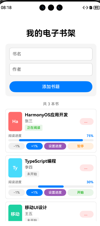 在数字化阅读时代,电子书管理已成为阅读爱好者的重要需求。本文将分享一个基于HarmonyOS的云书签应用开发实践,该应用实现了书籍管理、进度跟踪、阅读状态标记等核心功能,采用ArkUI框架构建现代化UI界面,并使用Preferences实现数据持久化存储。