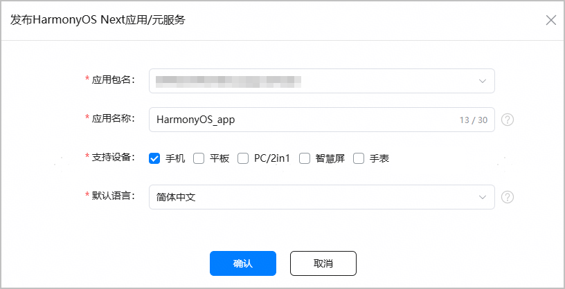 在弹出的“发布 HarmonyOS Next 应用/元服务”窗口,将应用信息补充完整。点击“确认”,进入“应用信息”界面。