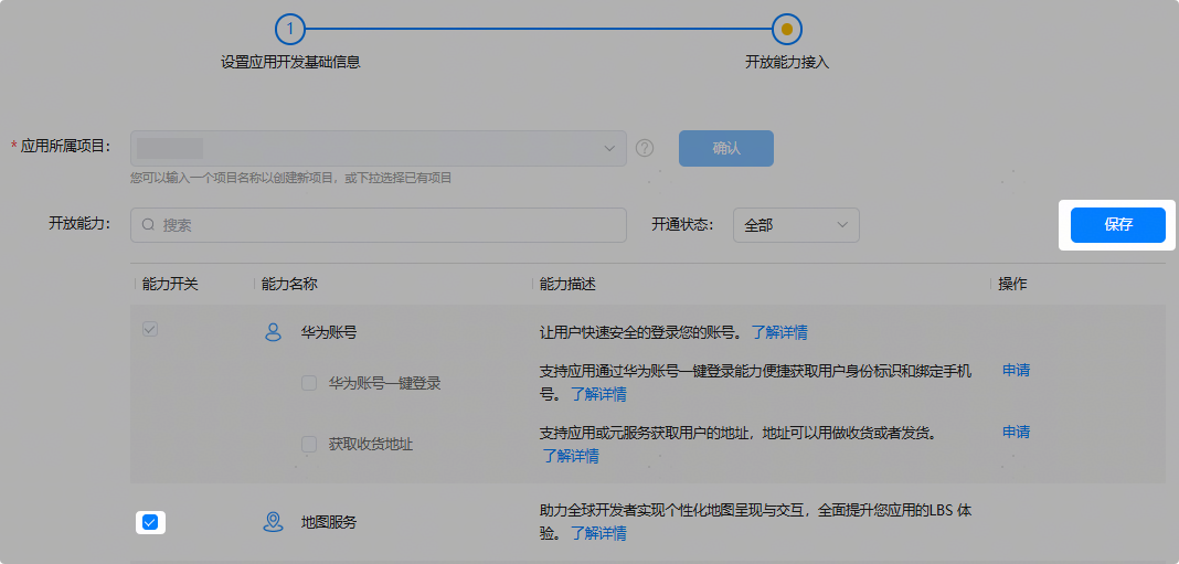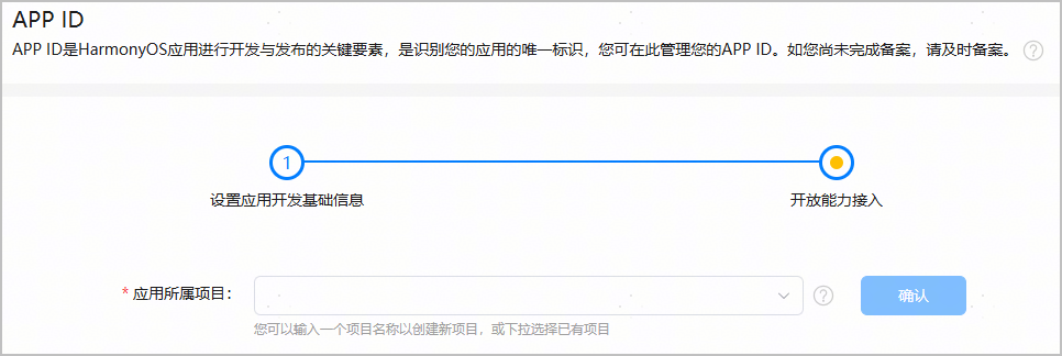 在“开放能力接入”页面,为应用选择所属的项目,完成后点击“确认”,应用 APP ID 即成功创建。