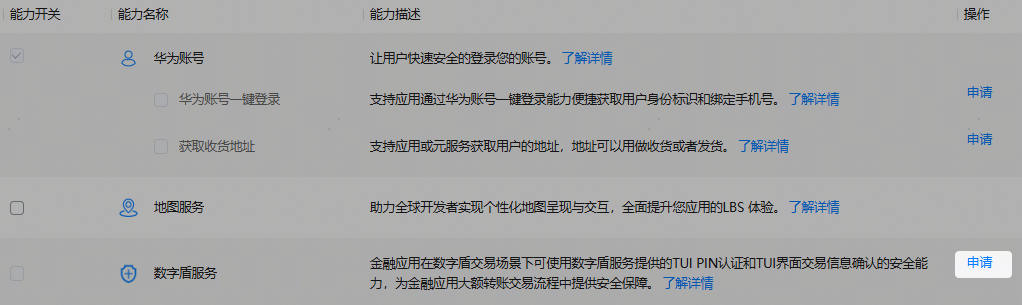 若开放能力包含主能力和子能力,需参考以上步骤分别申请主能力和子能力。以华为账号服务为例,“华为账号”为主能力,其下包含“获取收货地址”等多个子能力。当前 AGC 已默认为应用开启“华为账号”主能力,子能力则需分别自行申请开启。