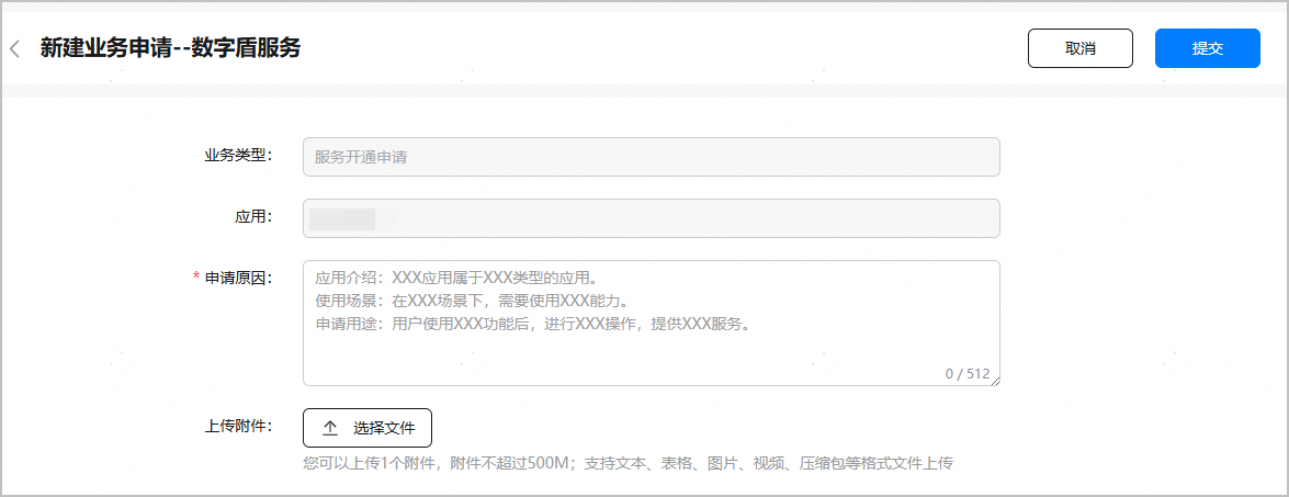 在“新建业务申请”窗口填写申请原因,必要时可上传附件,然后点击“提交”。各能力对申请原因与附件的要求可能存在差异,请按实际界面要求操作。