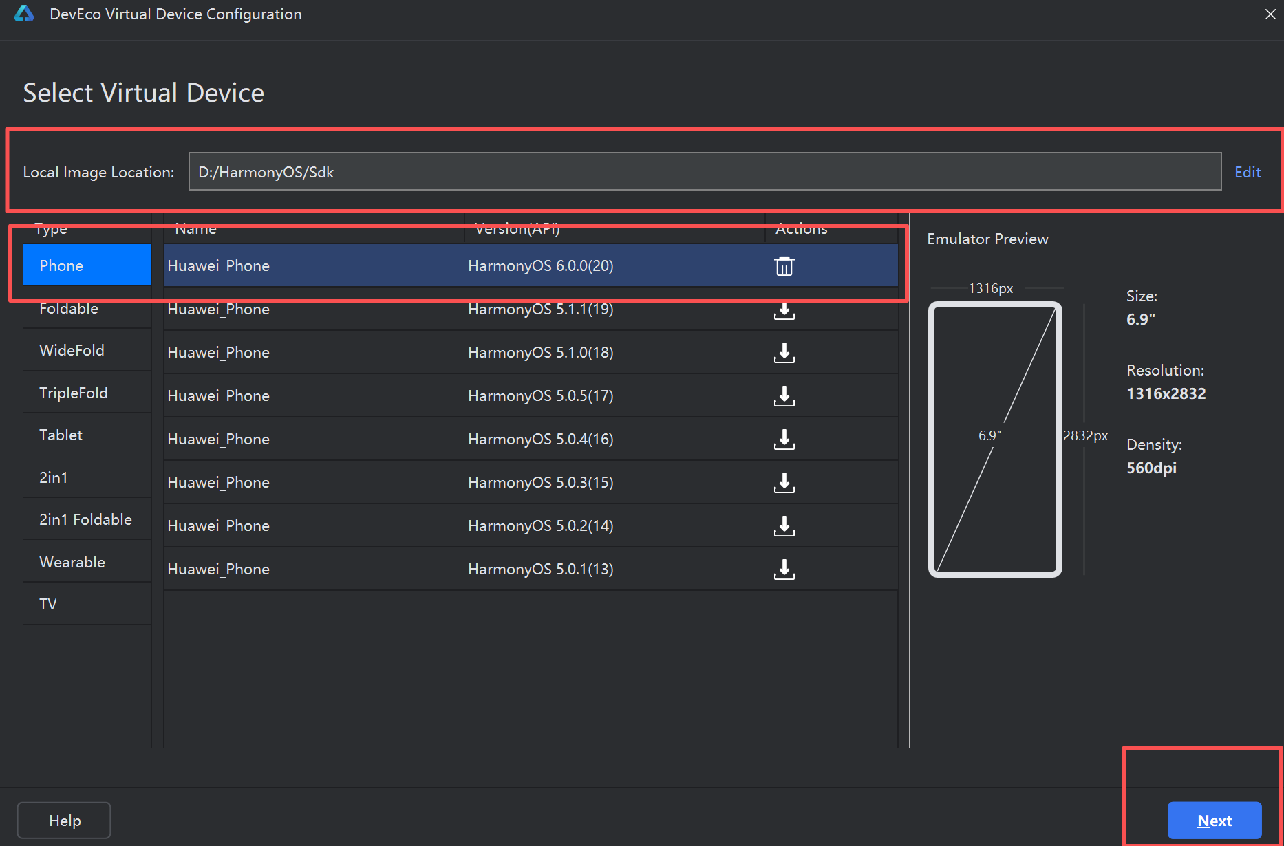 - 先选择安装镜像的地址 然后选择下载的鸿蒙版本 然后点击next