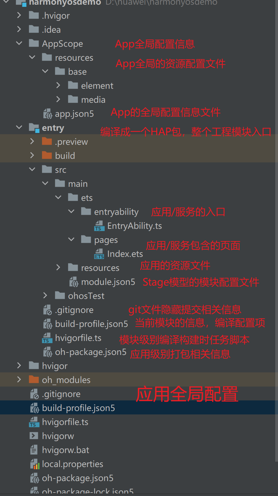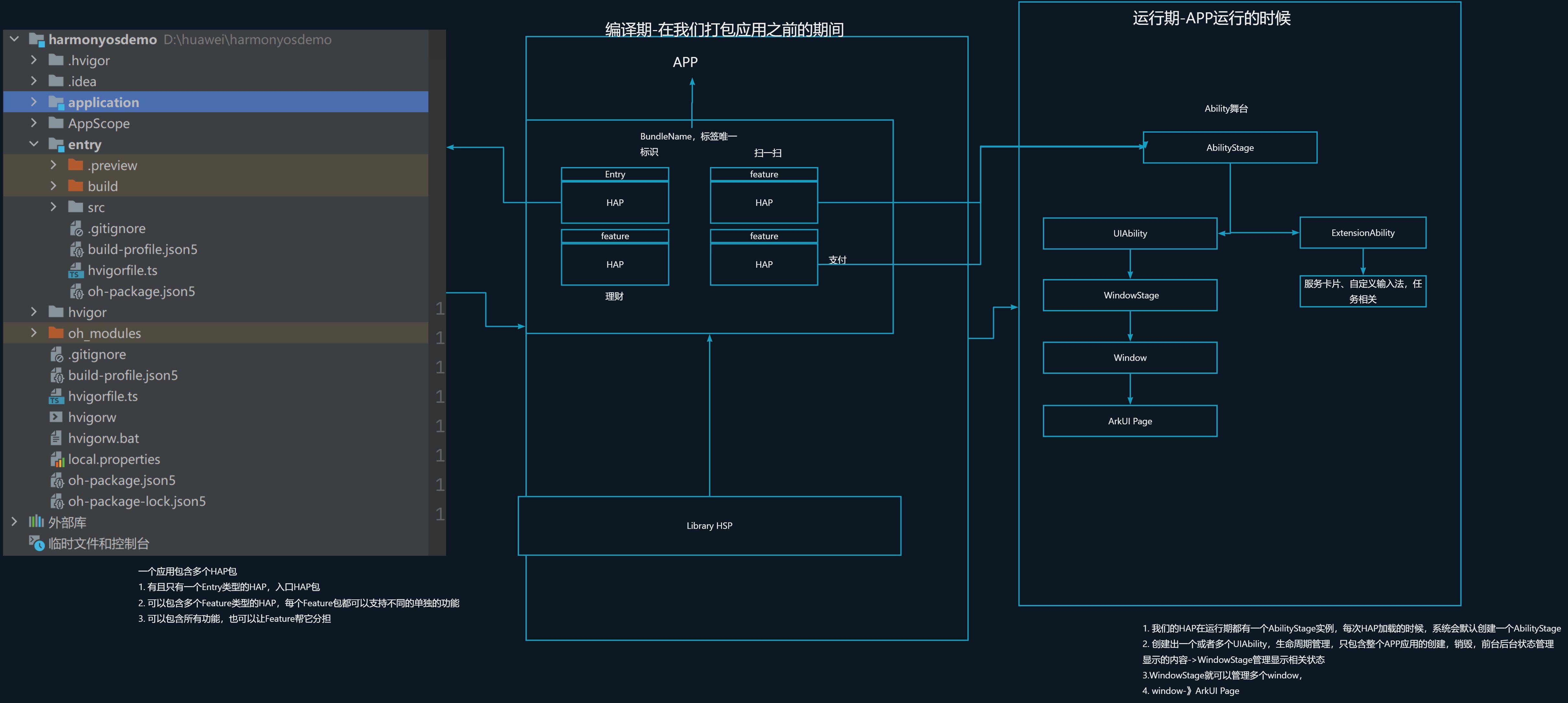 - 开发者通过DevEco Studio把应用程序编译为一个或者多个.hap后缀的文件,即HAP。HAP是HarmonyOS应用安装的基本单位,包含了编译后的代码、资源、三方库及配置文件。HAP可分为Entry和Feature两种类型。