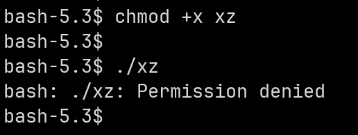 使用chmod +x xz命令为xz命令增加可执行权限之后,尝试运行,依然提示无权限。是因为需要先对其进行自签名。命令如下: