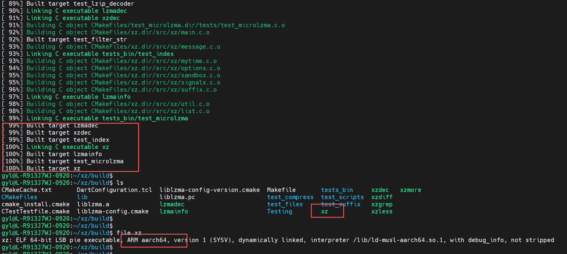 如下图所示,编译成功后得鸿蒙PC(aarch64)架构的xz命令。
