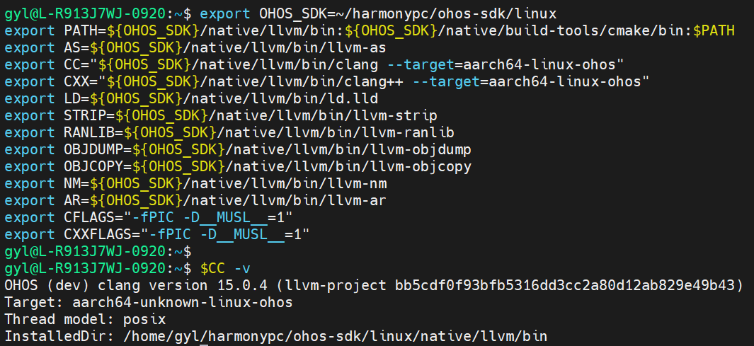 export CC="${OHOS_SDK}/native/llvm/bin/clang --target=aarch64-linux-ohos"